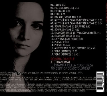 Born in Naples and living in Milan, Romina Daniele has carried on studies about history, methodology of art and aesthetics and has gone through different musical and didactic experiences. All the studies carried on over the last two years in poetry, music, vocalism, theatre and art, have been fundamental for the production of this record.
