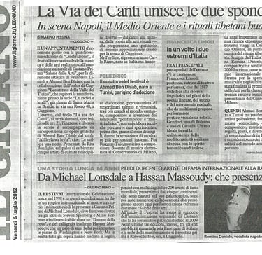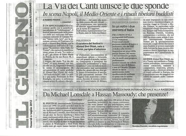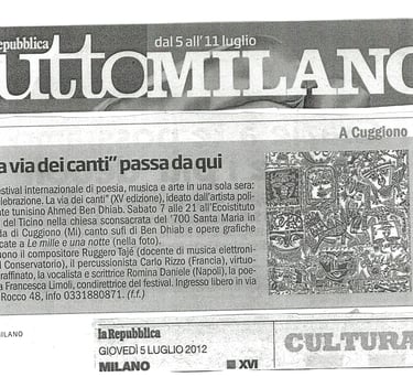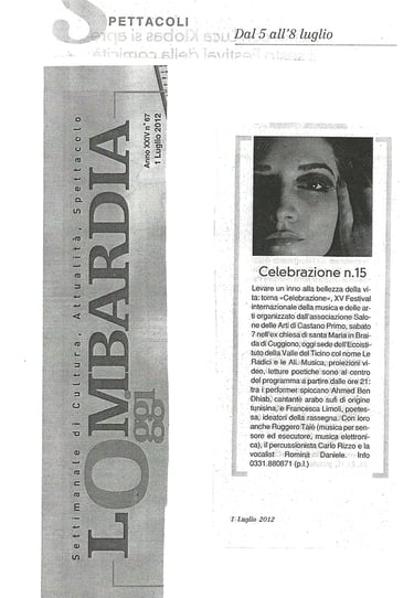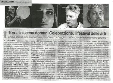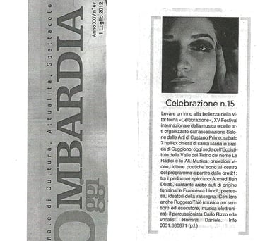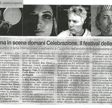 From left to right, the festival related press is following: Il Giorno, Prealpina, Repubblica, La Lombardia. July 2012. About Celebrazione Festival. Cuggiono (Mi) 2012.