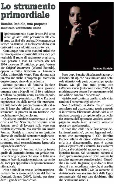 The album does not fall "into the false waters of non-conformism", as stated in the CD booklet. Romina Daniele refuses to be classified as an avant-garde artist, because this word seems empty and overused to her. Her research is directed at the origins of sound, not towards a hypothetical future. In the small volume included with the album, a long text stands out where Romina has collected numerous philosophical and musical considerations. Generally, when we find ourselves in front of a notable new artist, we say that "a star is born". But the Aischânomai singer is light years away from commercial logic. In her case we must say that "a voice is born".