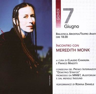 At the end of the Aterforum Festival 2007 open meeting dedicated to Meredith Monk, the young vocalist Romina Daniele (new project), who works in a research field that is strictly related to the Meredith Monk and Demetrio Stratos experiences, is performing pieces from her upcoming album.
