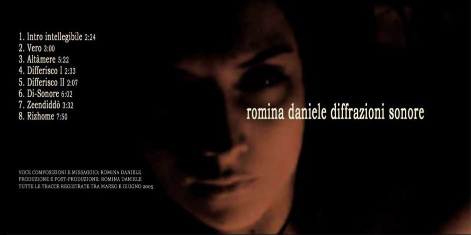 Il lavoro svolto da Romina Daniele in questi anni non deve essere stato un percorso facile. La ricerca, sulla base della quale, si basa tutto l’intero operato viene esasperata fino all’osso per poi essere ripresa in sequenze differenti ed improvvisate e solo successivamente inserita (quasi forzatamente) su di un supporto rigido. In questo supporto non troverete ne musica, ne canzoni, ne composizioni, ma soltanto tutta l’essenza più intima di Romina. Napoletana e probabilmente assai testarda Romina vuole questo lavoro sin dagli inizi, poco importa se ha studiato, se ha fatto il conservatorio o una miriade di concerti. Il risultato, la materia prima è tutta qui dentro. Il disagio, la felicità, il piacere, la serenità sono solo alcune delle sensazioni che Romina ci sa trasmettere attraverso lo strumento più versatile e plasmabile che ognuno ha a disposizione, la voce. L’intera opera si regge su questo, la voce presa come unica fonte di una qualsiasi melodia che da essa ne scaturisce. Quasi inconsciamente Romina mette in atto un’opera splendida per il panorama contemporaneo, che con tutta probabilità non avrà il fine che merita. Tutto il lavoro cresce intorno ad un’atmosfera quasi teatrale, che è resa ancora più marcata, dagli splendidi sali-scendi vocali di Romina. Cruda e assai viscerale l’artista riesce ad incantarci con splendidi spasmi che si incastrano alla perfezione l’uno con l’altro in un immaginario puzzle sonoro. Inutili a questo punto le divisioni in tracce; il lavoro potrebbe difatti iniziare e concludersi come un’unica grande opera.