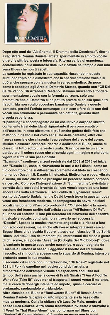 “Spannung” è un cofanetto che ha visto sette anni di 'gestazione', e che comprende ben tre dischi, uno rosso, il colore della copertina e del libretto (e 'rossa' è un po' anche l'immagine trasferita dalle belle foto dell'artista), uno blu e l'ultimo nero. Nel cd I, la voce di Romina Daniele, le sue composizioni e la sua elettronica. Nel secondo, senza intenti sottrattivi per poetica e linguaggio, il percorso vocale continua, ma con interlocuzioni maggiori: Luca Caiazza ed Emanuele Cutrona (Bass), Luca de Maio (Guitar), dando una visione più performativa, forse live, che completa ed integra lo spettro di ciò che può fare Romina Daniele, sia in senso tecnico-musicale (a noi già noto) ma soprattutto, qui, in senso progettuale. L'architettura di “Spannung” è solida, ben congegnata, appunto 'monolitica'.
