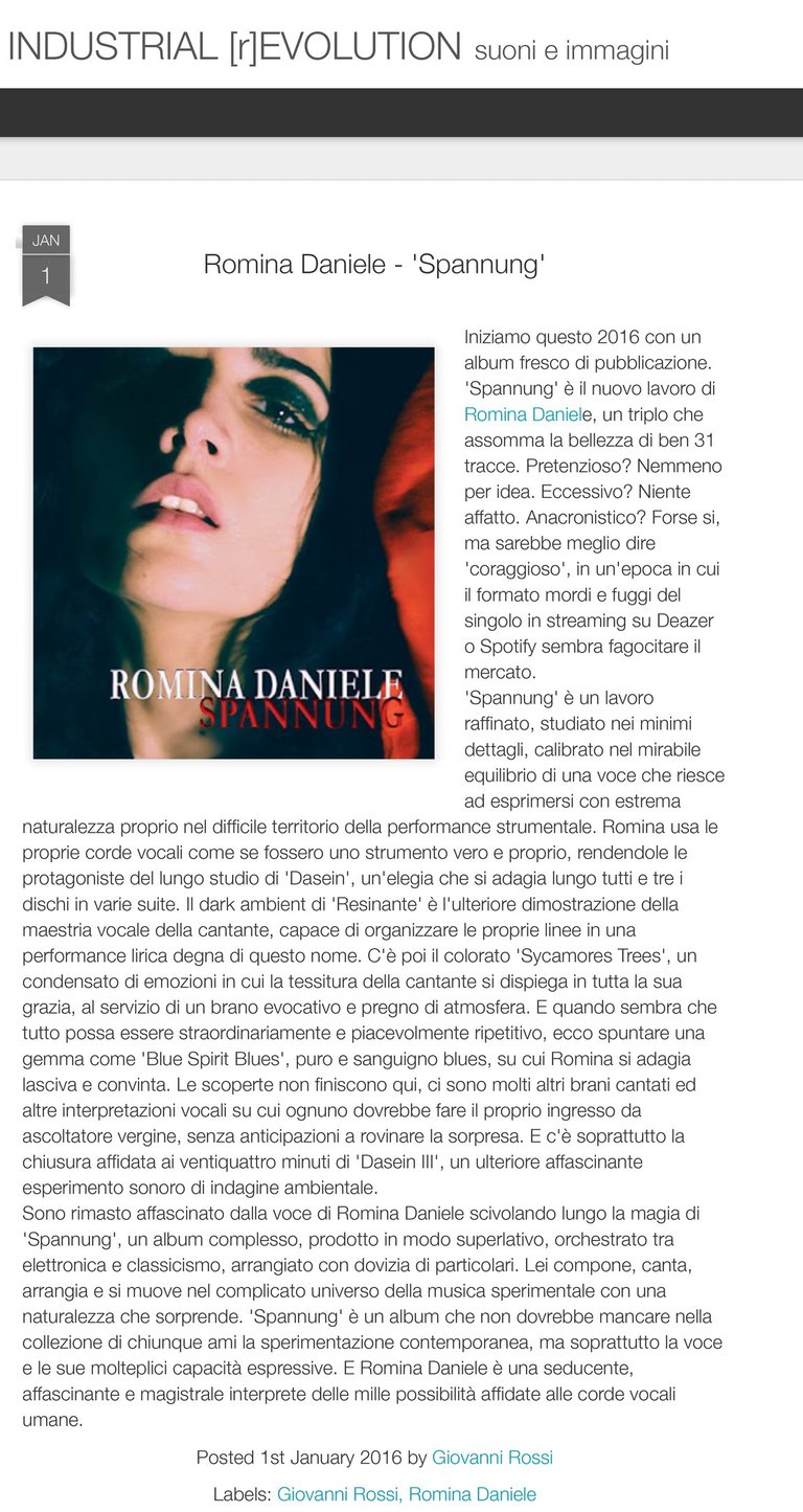 Sono rimasto affascinato dalla voce di Romina Daniele scivolando lungo la magia di 'Spannung', un album complesso, prodotto in modo superlativo, orchestrato tra elettronica e classicismo, arrangiato con dovizia di particolari. Lei compone, canta, arrangia e si muove nel complicato universo della musica sperimentale con una naturalezza che sorprende. 'Spannung' è un album che non dovrebbe mancare nella collezione di chiunque ami la sperimentazione contemporanea, ma soprattutto la voce e le sue molteplici capacità espressive. E Romina Daniele è una seducente, affascinante e magistrale interprete delle mille possibilità affidate alle corde vocali umane. [Giovanni Rossi per Industrial Revolution]