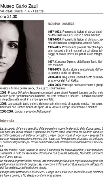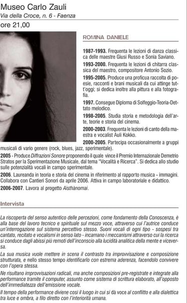 La riscoperta del senso autentico delle percezioni, come fondamento della Conoscenza, è alla base del lavoro tecnico e spirituale sul mezzo voce, attraverso cui l'autrice conduce un'interrogazione sul sistema percettivo stesso. Suoni vocali di ogni tipo - sospesi tra cantato, recitato e vocalismi in senso lato - incarnano i meccanismi attraverso cui la ricerca si conduce dagli abissi più remoti dell'inconscio alla lucidità analitica della mente e viceversa.