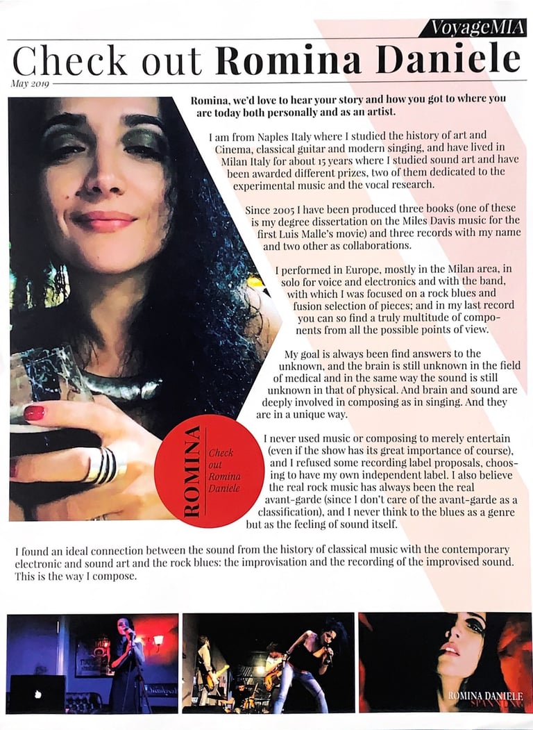 Mi sono esibita in Europa, principalmente nell'area di Milano, come solista per voce ed elettronica e con la band, con cui ero concentrata su una selezione di brani rock blues e fusion; e nel mio ultimo disco puoi quindi trovare una moltitudine di componenti da tutti i possibili punti di vista.