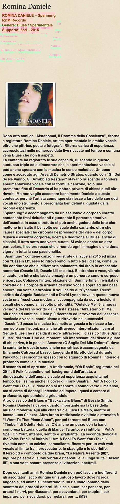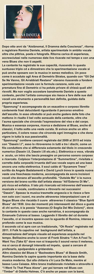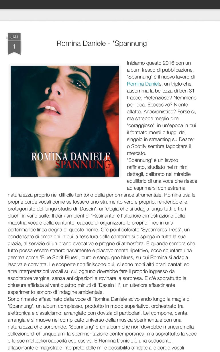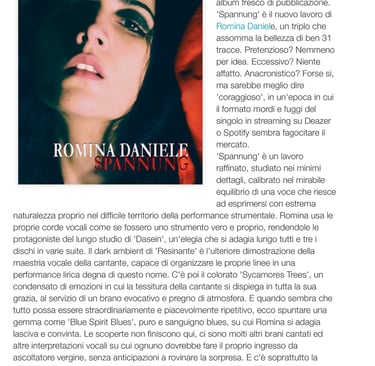 << Starting the 2016 with a freshly released album. 'Spannung' is Romina Daniele's new work, a triple that sums up the beauty of 31 tracks. Pretentious? Not at all. Excessive? Not at all. Anachronistic? Maybe yes, but it would be better to say 'courageous', in an era in which the hit-and-run format of the single streaming on Deazer or Spotify seems to be swallowing up the market.