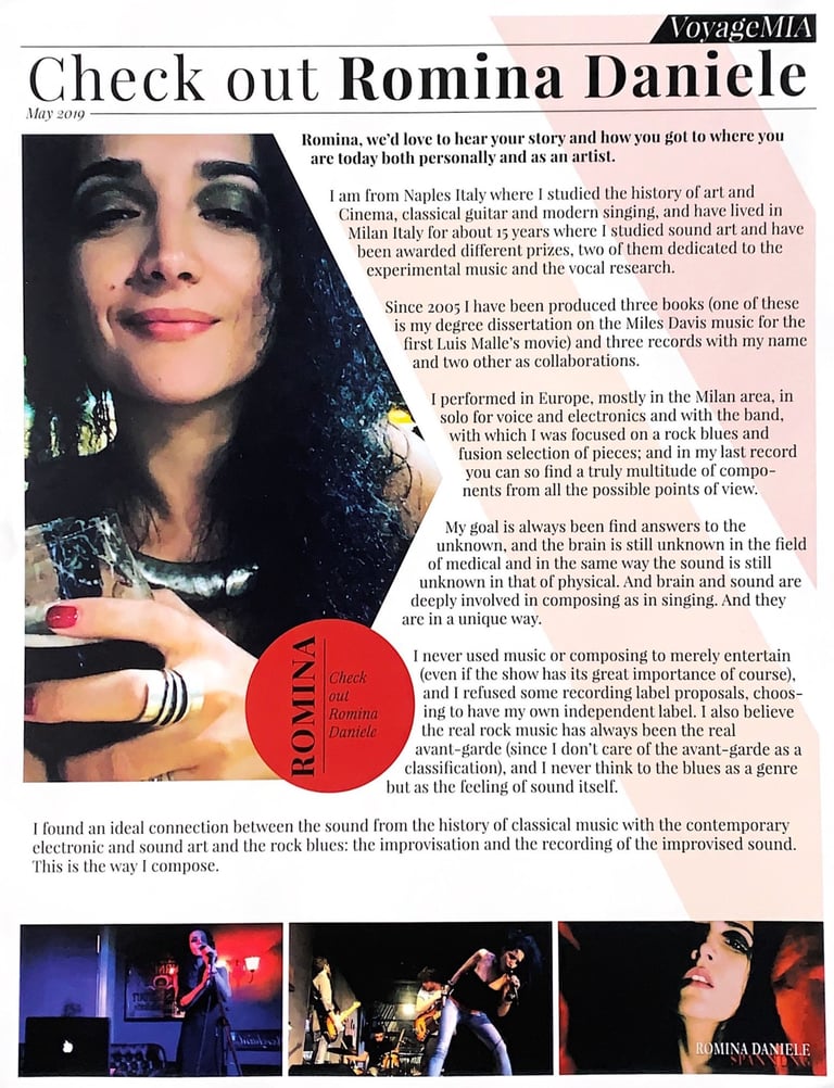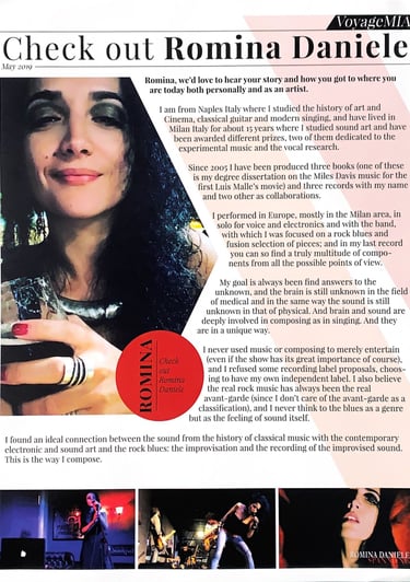 I performed in Europe, mostly in the Milan area, in solo for voice and electronics and with the band, with which I was focused on a rock blues and fusion selection of pieces; and in my last record you can so find a truly multitude of components from all the possible points of view.